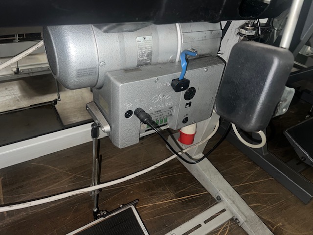 3-TRANSPORT 1-NEEDLE SEWING MACHINE, FOR HEMMING, WITH CROCHET ON THE LEFT SIDE, EFKA DIGITAL POSITIONING MOTOR 380V, PNEUMATIC FOOT-LIFTER (HAMMERED GREY)