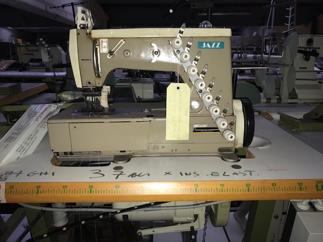 MACCHINA PER CUCIRE BEIGE A 4 AGHI DA 37mm CON INSERIMENTO FILO ELASTICO, CON PULLER POSTERIORE. MARCATA NECCHI.